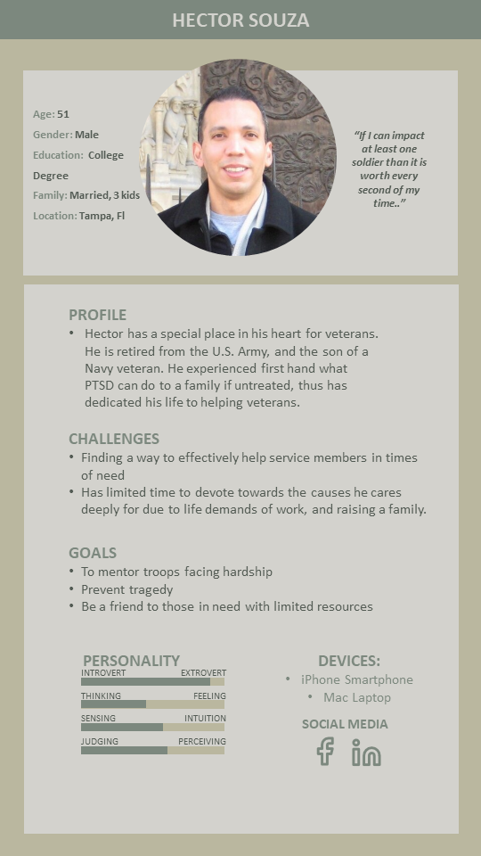 As a First Sergeant in the U.S. Air Force, I understand hardships through the stories and shared experiences of those in uniform. I am a part of a military member's Leadership, but there are times when a soldier doesn't feel comfortable allowing their leadership to know their problems due to stigma, and also may not want to tell friends or family for personal reasons. This app allows someone to reach out to fellow, but relatively unknown helping vets.